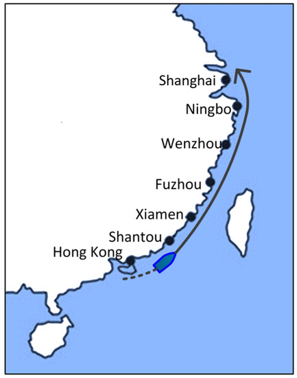The case study’s ship departed from western Hong Kong at 1:00 p.m. on 10 July and arrived in southern Shanghai at 10:00 p.m. on 13 July. The geographically closest typical cities along the route are Hong Kong (12 h), Shantou (7 h), Xiamen (15 h), Fuzhou (15 h), Wenzhou (16 h), Ningbo (15 h), and Shanghai (16 h). The ship’s heading angle changed from N70° E to N30° W along the course.