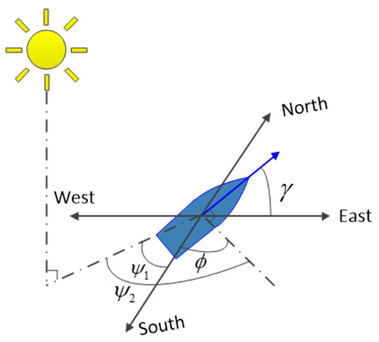 Compared to onshore buildings, ships experience more frequent changes in navigation areas, courses, and weather conditions during their voyages, resulting in more severe fluctuations in the cooling load inside the cabins. However, it is difficult to gather accurate data on marine weather conditions along the course of a ship’s journey. To model the dynamic meteorological conditions of the ship, a method utilizing weather parameters from a typical city that is geographically closest to the ship over its entire voyage is adopted in this study. These typical cities’ weather parameters, including hourly information, such as temperature, humidity, and solar radiation, can be obtained through EPW format weather files, which are publicly available from the U.S. Department of Energy. Furthermore, during the ship’s voyage, changes in the ship’s heading angle will cause a variation in the azimuth angle of the sun relative to the ship, leading to a change in the intensity of direct solar radiation on the ship and thus affecting the variation in the cooling load inside the cabin. Hence, this influence of the ship’s heading angle on the cooling load inside the cabin was also considered as we modeled the ship’s dynamic conditions in TRNSYS. As shown in Figure 5, at the current position, the ship’s cabin balcony is facing . The azimuth angle of the sun relative to the ship is equal to the sum of the sun’s azimuth angle and the ship’s heading angle .