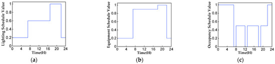The internal load profile of the cabin: (a) lighting schedule; (b) equipment schedule; (c) occupancy schedule.