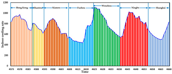 The dynamic cooling loads inside the cabin, considering various navigational areas, changing weather conditions, and the ship’s position and heading angle, are shown in Figure 7. It can be seen that the indoor cooling rate is relatively high near Hong Kong, around 4623 h and 4645 h, due to the high ambient temperature, which is greater than 30 °C during these time periods. As the ship sailed from Xiamen toward Fuzhou, the ambient temperature dropped to around 24 degrees Celsius, which is relatively low. This change led to a significant reduction in the indoor cooling load. Furthermore, despite the outdoor temperature remaining around 27 degrees Celsius closer to Shanghai, the incidence of the sun’s radiation decreased as the ship’s heading angle faced northwest. This decrease caused the cabin balcony to move away from the sun’s direction and resulted in a relatively low cooling load. Overall, compared to using one typical weather file, considering the weather conditions in different navigational areas and the changes in the ship’s heading angle can lead to more accurate modeling of the dynamic environment during the ship’s navigation. This greater accuracy, in turn, can enable more effective control of the cabin air conditioning system.