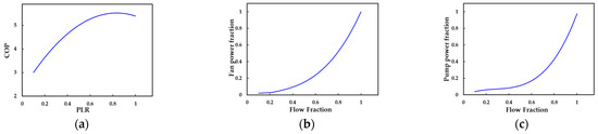 Performance curves of chiller, fan, and pump: (a) the variation of the chiller COP with part load ratio (PLR); (b) fan power fraction with air flow fraction; (c) pump power fraction with water flow fraction.