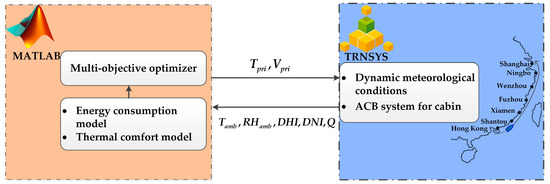 After constructing multi-objective functions in MATLAB, the improved multi-objective salp swarm algorithm (IMMSA) is utilized to solve the problem and obtain the optimal Pareto front. The knee point solution selection strategy is then applied to identify the optimal values . The TRNSYS model runs using the optimal setpoints until the next timestep. Then, MATLAB receives updated parameters and formulates the multi-objective model again, calculating the optimal values to be passed to TRNSYS. This process repeats until the specified number of timesteps is reached. In this study, a total of 96 timesteps are considered, representing a four-day journey from Hong Kong to Shanghai.