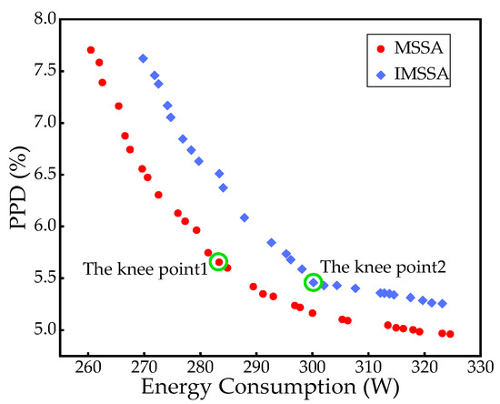 To compare the convergence accuracy of the MSSA and IMSSA, the Pareto fronts with knee points obtained by both algorithms at 6:00 a.m. on 14 July as an example are shown in Figure 12. On the left side of the knee point, a small increase in energy consumption leads to a significant improvement in thermal comfort; On the right side of the knee point, increasing energy consumption has little effect on PPD, suggesting that further energy consumption does not contribute significantly to improved thermal comfort. Moreover, it can be seen that the solution set produced by the IMSSA is closer to the coordinate axis, which dominates the solutions generated by the MSSA. That is, the IMSSA is more effective in directing the solution set toward the global optimum with higher precision. Furthermore, the IMSSA can also obtain a more widely and uniformly spread out set of non-dominated solutions than the original MSSA, thus producing a more efficient trade-off knee point.