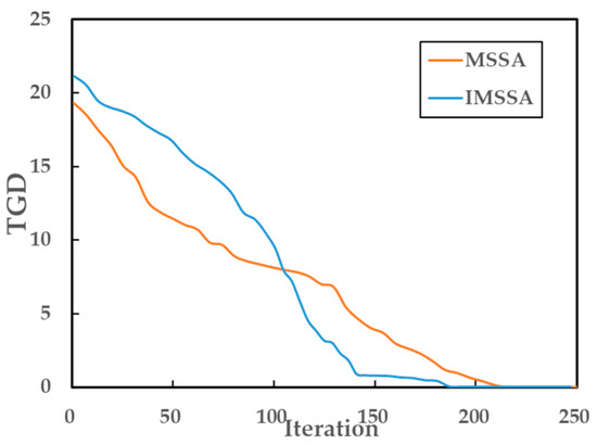 To compare the convergence speed of the algorithms, two-generation distance (TGD) is utilized in this study. TGD describes the distance between the adjacent two generations of non-dominated solutions. A large TGD means a strong global search ability, while a small TGD means a strong local search ability. Figure 13 shows that the TGD of the MSSA and m-MSSA gradually decreases until stabilizing around 0, indicating that they both possess a strong global search ability in the early stage and a strong local search ability in the later stage. Additionally, it can also be seen that the TGD of the m-MSSA is larger than that of the MSSA in the first 100 iterations and then decreases dramatically, indicating that the m-MSSA shows a stronger global search ability in the initial stage, while in the later stage, it can quickly switch to a stronger local search ability. Both algorithms are considered to converge when the TGD of five consecutive iterations is less than 1. As shown in Figure 13, the m-MSSA exhibits a faster convergence speed, which basically converges after 141 iterations, compared to MSSA’s 191 iterations.