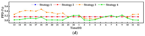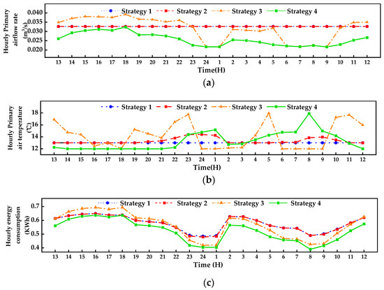 Figure 14 illustrates the hourly primary air temperature, air flowrate, energy consumption, and PPD of the ACB system on the first day of the ship under different strategies. In strategy 1, the primary air temperature is fixed at 13 °C and the primary airflow rate at 0.0327 m3/s. Strategy 2 adjusts the primary air temperature in real time based on the outdoor temperature. Specifically, from 1 p.m. to 6 p.m., when the outdoor temperature is relatively high, the primary air temperature is low. Conversely, during periods of low outdoor temperature, between 7 p.m. and 1 a.m., the primary air temperature is relatively high. Afterward, as the outdoor temperature begins to rise again, the primary air temperature starts to decrease. Compared to the fixed value strategy, strategy 2 increases the primary air temperature during the low temperature period, which decreases the cooling demand for the AHU chiller and results in slight energy savings. Strategies 3 and 4 optimize the primary air temperature and primary airflow rate simultaneously with the objectives of minimizing the energy consumption while maintaining cabin comfort. Compared to the MSSA algorithm used in control strategy 3, the IMSSA algorithm used in control strategy 4 can obtain a more accurate Pareto front, with lower energy consumption and lower PPD values. During the period from 1 p.m. to 10 p.m., strategy 4 obtains an optimal primary air temperature that is less than 13 °C, close to 12 °C, with a lower primary airflow rate compared to other control strategies. Moreover, to balance the indoor cooling load, which is relatively high during this time, the chilled water flow rate in the ACB terminal unit is maintained at a relatively high level because the cooling coil typically has higher energy efficiency compared to primary air [20,26]. However, the primary air temperature cannot necessarily be lowered to the minimum temperature because doing so would result in a very low primary airflow rate, leading to an increase in PPD and affecting indoor comfort. Therefore, the IMSSA can balance the energy consumption and thermal comfort while meeting the demand of the cooling load.