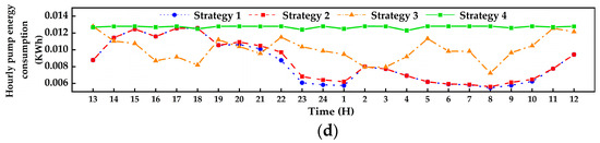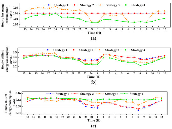 Hourly energy consumption using different control strategies on the first day of the ship’s navigation: (a) fan; (b) chiller 1 for the AHU; (c) chiller 2 for the ACB terminal; (d) pump.