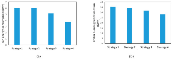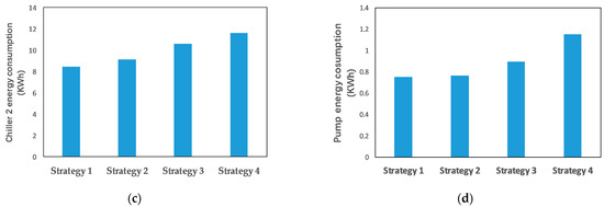 Energy consumption of different components under different control strategies: (a) fan; (b) chiller 1 for the AHU; (c) chiller 2 for the ACB terminal; (d) pump.