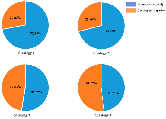 The energy consumption of different components of the ACB system is shown in Figure 16. Chillers have the highest energy consumption, with values of 43.74 kWh, 43.34 kWh, 42.31 kWh, and 39.59 kWh for strategies 1–4, respectively. The next highest is the fan, with 6 kWh for strategy 1 and strategy 2, 5.12 kWh for strategy 3, and 3.75 kWh for strategy 4. The pump has the lowest energy consumption, which remains around 1 kWh for all four strategies. Compared to strategy 1, strategy 2 reduces the energy consumption of chiller 1 by 1.06 kWh and increases the energy consumption of chiller 2 by 0.67 kWh because strategy 2 increases the supply air temperature when the outside temperature is relatively low, reducing the cooling demand for chiller 1 and lowering its energy consumption. However, to meet the indoor cooling load requirements, the cooling load on the coil increases, resulting in an increase in the energy consumption of chiller 2. Strategies 3 and 4 optimize the primary air flowrate and temperature. By finding the optimal values, they reduce the fan energy consumption by 0.88 kWh and 2.25 kWh, respectively, and significantly reduce the energy consumption of chiller 1 by 3.6 kWh and 7.43 kWh while slightly increasing the energy consumption of chiller 2 by 2.11 kWh and 3.16 kWh because the cooling coil served by chiller 2 is more energy efficient compared to the primary air cooled by chiller 1. As shown in Figure 17, compared to strategy 1, strategies 2–4 all increase the cooling capacity of the ACB terminal’s coil served by chiller 2. This increase results in an increase of 1.09%, 19.56%, and 23.92%, respectively, compared to 19.89 kW with strategy 1. By allocating more of the room’s cooling load to the cooling coil and reducing the room’s cooling load on the primary air, the overall energy consumption of the entire system can be reduced.