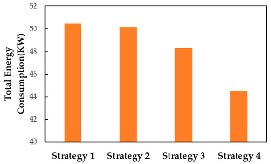 Figure 18 shows the energy consumption for different control strategies during the voyage from Hong Kong to Shanghai. The results indicate that strategy 1, using fixed primary air temperatures and airflow rates, had the highest energy consumption of 50.51 kWh. In contrast, strategy 4, which employs the IMSSA, had the lowest energy consumption of 44.49 kWh, resulting in energy savings of 12.0% compared to strategy 1, 11.1% compared to Strategys 2, and 7.9% compared to the original MSSA.