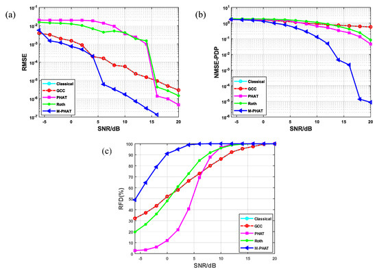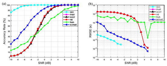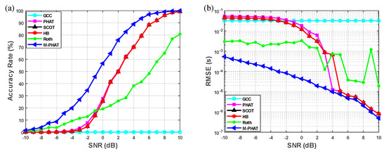 of the SNR. The values of the PHAT, SCOT and HB functions were almost the same, and their curves were lower than that of the M-PHAT function. When the SNR was greater than −2 dB, the of the M-PHAT function was approximately 3 dB higher than those of the aforementioned three functions. The accuracy of the ROTH function was approximately linearly related to the SNR, but it was still lower than that of the M-PHAT function. When the SNR was lower than 6 dB, the difference between the accuracies of the two functions increased with an increase in the SNR, and the maximum difference was 50%. Figure 4b shows the RMSEs of the estimated delay of various weighted functions under different SNRs. The M-PHAT function exhibited the lowest RMSE across all SNR levels and performed optimally. When the SNR fell below 4 dB, the RMSE of the M-PHAT function reduced by two orders of magnitude compared with those of the PHAT, SCOT and HB functions. Furthermore, the overall RMSE reduced by an order of magnitude compared with the ROTH function. In conclusion, the simulation verified that the M-PHAT function exhibited a superior resolution of the delay and robustness under low SNR levels.