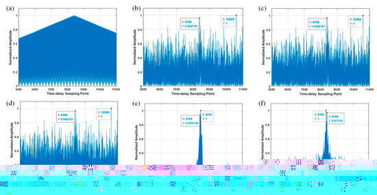 GCC algorithms based on different weighted functions when the SNR was −5 dB: (a) GCC algorithm; (b) PHAT-weighted algorithm; (c) SCOT-weighted algorithm; (d) HB-weighted algorithm; (e) ROTH-weighted algorithm; (f) M-PHAT-weighted algorithm.