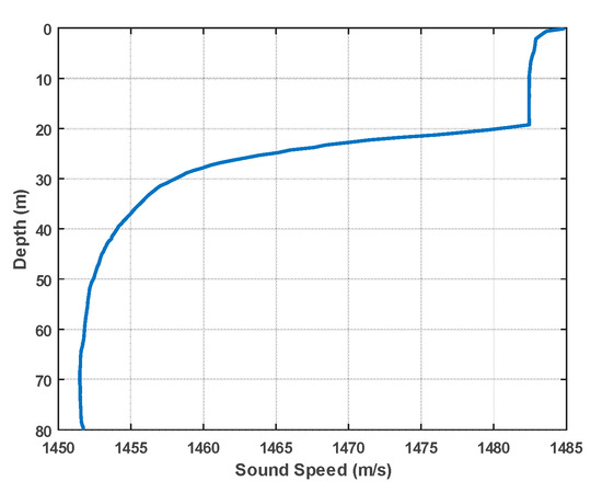 Figure 5 shows the sound-velocity profile used by Bellhop, and Figure 6 exhibits the channel’s impulse response at the receiving point. The impulse response indicates that only two sound rays reached the receiving point, with a difference in the delay of 1.4878 ms. Figure 7 presents the estimated results of the different algorithms. In the previous sections, this study showed that the PHAT, SCOT and HB functions exhibited nearly identical performances. Consequently, the PHAT function was chosen as the representative of these three weighted functions.