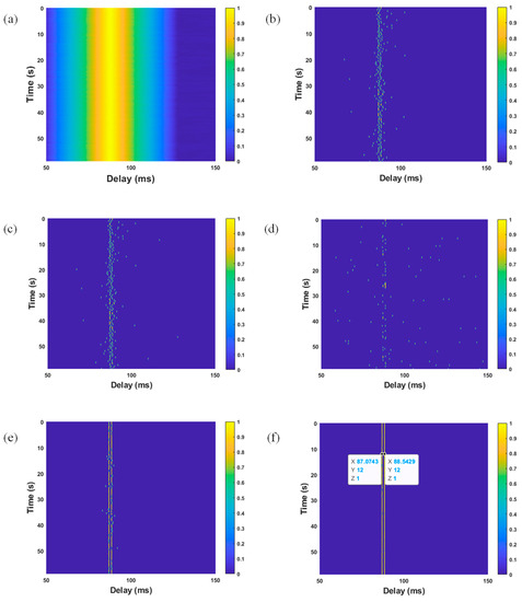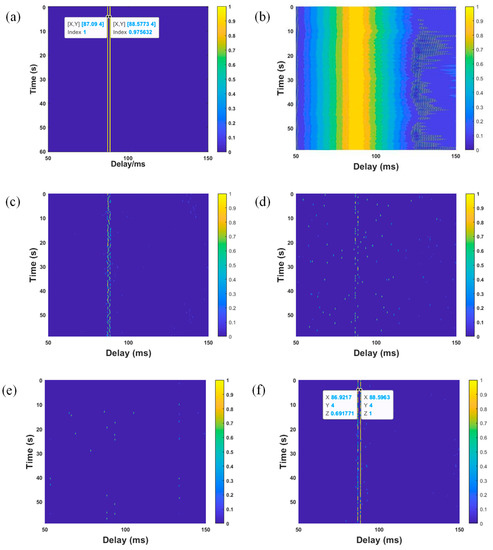 In Equation (13), is the number of correct estimates; when the estimated value is consistent with the real value, it is recorded as a correct estimate. is the total number of estimates, L is the number of acoustic paths, is the jth element in the real-delay vector and is the jth element of the delay vector in the ith estimation. When there is only one channel delay, Equation (14) can be simplified to the following: