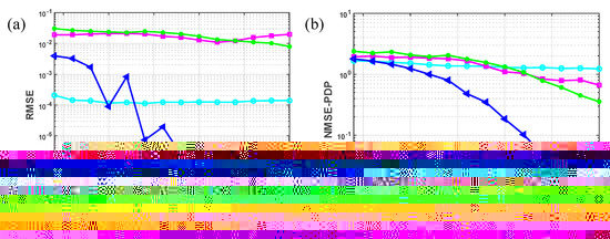 The channel’s power-delay profile (PDP) [37] contains crucial information about the channel, including the path intensity, density and distance between the transmitter and the receiver, or between the detector and the target. Therefore, the PDP is a very important assessment criterion. The PDP can be obtained by reducing the dimensions of the DSSF, which means removing the scale dimension. The normalized mean squared error of the power-delay profile () can be expressed as follows: