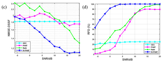 performed the same, and their values were always higher than that of the M-PHAT algorithm; the of the ROTH function at a low SNR was smaller than that of the PHAT and the other two functions but was still higher than that of the M-PHAT function. The results of the simulation showed that the M-PHAT function had the best performance, except for the GCC, with the single-path channel model.