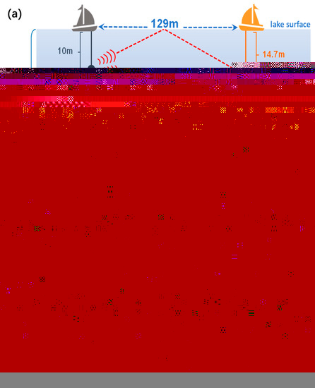 The channel testing experiment was conducted at Lake Qiandao in Hangzhou at the end of November 2022. The experimental setup and the construction of the experimental system are illustrated in Figure 11a,b, and the parameters of the experimental equipment and transmitted signal are shown in Table 4. The gradient of the velocity of the sound measured in the experimental area of the water is depicted in Figure 5.