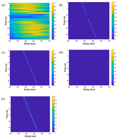 (a) Estimation of the channel based on the matched filtering algorithm. (b) Estimation of the channel based on the GCC-OMP algorithm. (c) Estimation of the channel based on the PHAT-OMP algorithm. (d) Estimation of the channel based on the ROTH OMP algorithm. (e) Estimation of the channel based on the M-PHAT-OMP algorithm.