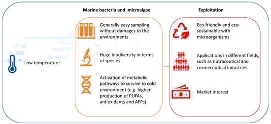 Schematic representation of review subjects: Exploitation of high value molecules from marine bacteria and microalgae from cold environments. PUFAs stand for polyunsaturated fatty acids, while AFPs for antifreeze proteins.