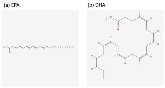 Chemical structure of (a) eicosapentaenoic acid (EPA) and (b) docosahexaenoic acid (DHA) from the database PubChem (https://pubchem.ncbi.nlm.nih.gov/compound/135002#section=2D-Structure and https://pubchem.ncbi.nlm.nih.gov/compound/445580#section=2D-Structure, respectively; accessed on 16 January 2023).
