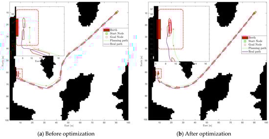 Specifically, in the berthing path planning in Figure 6, the left side of Figure 6a is without optimization processing. In the middle part of the figure, the path planned by the APF algorithm has many waypoints. After optimization processing, Figure 6b has much less twisting and turning, and the overall path becomes smoother. This smoothed path can effectively reduce the rudder angle changes of the ship during sailing and reduce the number of manipulations, and this change can be verified in the curve of the ship’s rudder angle changes in Figure 9.