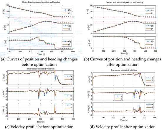Figure 6 and Figure 7 delineate the autonomous berthing process of a USV under specific wind and current interference conditions (stabilization outside the berth followed by parallel berthing). Figure 6a and Figure 7a represent the nonoptimized scenarios. Figure 6b and Figure 7b display the optimal control profiles obtained through the CMA-ES optimization approach. A comparative analysis between Figure 7a,b reveals that even with wind and current, the CMA-ES optimized control system still shows competence in mitigating abrupt fluctuations in the ship’s motion and amplitude.