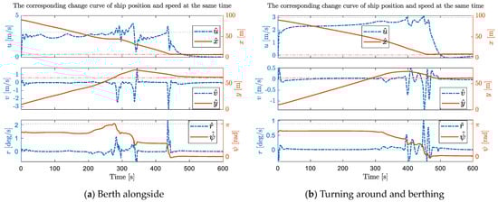 According to the simulation results of the two berthing strategies under the same environment in Figure 8, it can be analyzed that: when there are strong wind and current disturbances to the ship’s berthing motion, the control difficulty of the ship increases in Figure 8a when berthing directly, and the probability of collision with the berth is increased; the turning strategy in Figure 8b can effectively offset the strong wind and current interference to the ship and ensure the safety of ship berthing. Choosing a suitable berthing strategy is also a way to reduce the risk of berthing collision and ensure the safety of ship berthing. The motion process curves of the two different berthing strategies are shown in Figure 11.