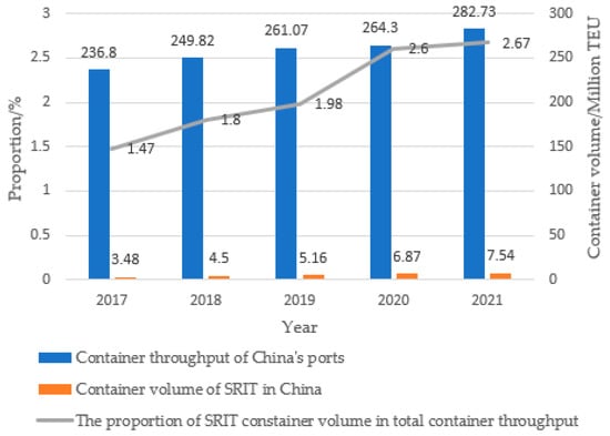 Container volume and proportion of sea–rail intermodal transportation in China for 2017–2021.