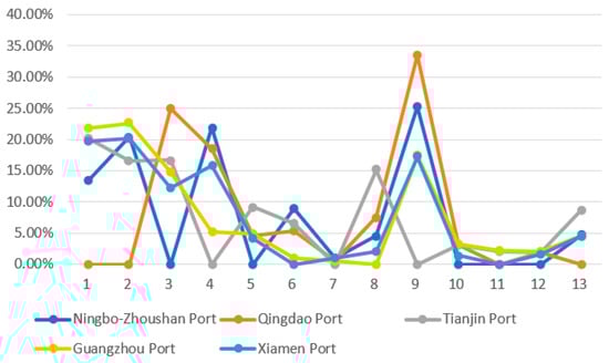 - Ren, J.; Dong, L.; Sun, L. Competitiveness prioritisation of container ports in Asia under the background of China’s Belt and Road initiative. Transp. Rev. 2018, 38, 436–456. [Google Scholar] [CrossRef]