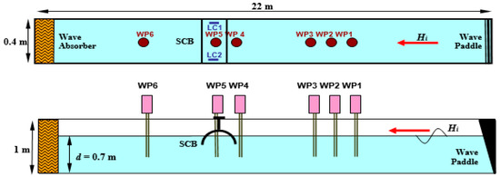 The experimental work was conducted at the Hydraulics Laboratory of the School of Engineering, University of Edinburgh. To generate unidirectional regular and irregular waves, a wave flume with dimensions of 22 m in length, 0.4 m in width, and 0.7 m in depth was employed (refer to Figure 2). The process of wave generation was carried out through the utilization of a flap-type active absorption wave generator, which was developed by Edinburgh Designs. Passive wave absorbing “beaches” were installed at the down-wave end of the wave flume during the experiments in order to reduce wave reflection from the end wall. The flume was equipped with six resistance-type wave probes (WP1 to WP6) that were strategically positioned to measure water surface elevations at different locations. Using the least squares method, incident and reflected waves were separated for the first three probes (WP1 to WP3) that were placed closest to the wave generator [32]. WP4, positioned at a distance of 50 mm from the seaward wall of the model, measured the water surface elevation in front of the model, providing information on Hf wave heights at that specific location. WP6, located 2.5 m from the leeward wall of the model, measured transmitted waves and offered insights into Ht wave heights at that particular position. For the perforated models, WP5 was positioned through one of the rectangular openings near the crown, allowing for the measurement of Hc wave heights and capturing the fluctuation of water level within the interference chamber. In the case of the SCB0 model, a small opening was made at the crown of the breakwater to insert WP5 for water level measurement. These Hc wave heights provided valuable data on the water level fluctuations in specific areas of interest. Additionally, two load cells (LC1 and LC2) were attached at the crest of the submerged breakwater (SCB) model to measure the horizontal wave forces. The utilization of two load cells (LC1 and LC2) at both ends of the breakwater presented several advantages, despite the symmetrical nature of the model. Firstly, this configuration enabled the accurate measurement of forces and load distribution at the breakwater’s ends, facilitating valuable insights into its response to applied loads. Additionally, the implementation of two load cells offered redundancy and allowed for the cross-validation of measurements, ensuring the reliability and accuracy of the collected data. It should be noted that due to resource limitations, only two load cells were available for use. Nonetheless, these two load cells effectively provided the necessary information pertaining to load distribution and the behavior of the breakwater model. Prior to each experimental session, both the wave probes and load cells underwent meticulous calibration.
