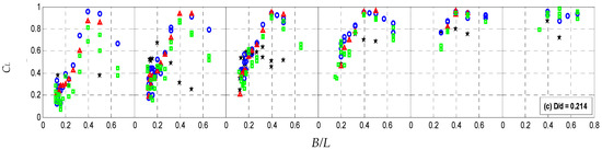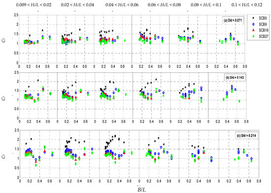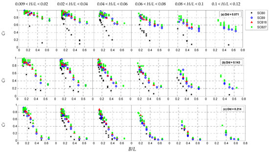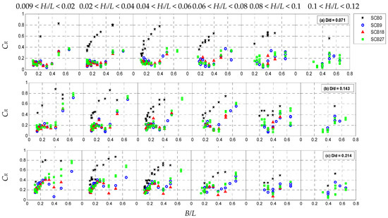 The relationship between reflection coefficients (CR) and the relative breakwater width (B/L), relative wave height (Hi/L), and relative breakwater draft (D/d) is depicted in Figure 4. The plots reveal that the CR of the impermeable SCB0 model increased with an increase in B/L and a decrease in Hi/L, indicating higher reflectivity for shorter-period waves and smaller wave heights. The maximum CR values obtained for D/d = 0.071, 0.143, and 0.214 were 0.83, 0.87, and 0.86, respectively.