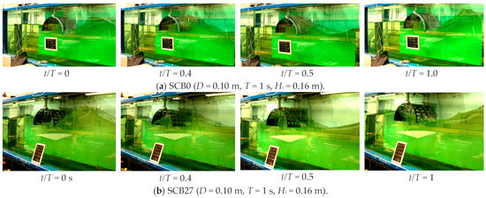 The mechanisms of energy dissipation observed in the SCB models were examined using still images and videos. Figure 5 presents a sequential representation of the wave action on the SCB0 and SCB27 models. Both models were placed in a water depth of 0.10 m and subjected to waves with a period of 1 s and a height of 0.16 m. The waves propagated from the right side to the left side in the images. Both models showed that the bottom of the front wall was reached during the trough of a wave cycle when t/T equaled 0. At this point, just below the front wall, the SCB0 model caused eddies to form.
