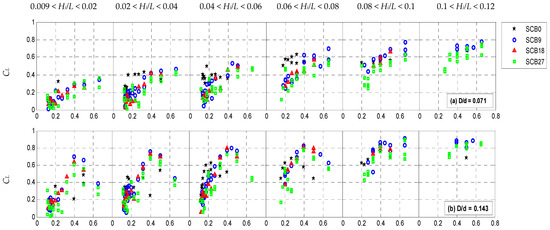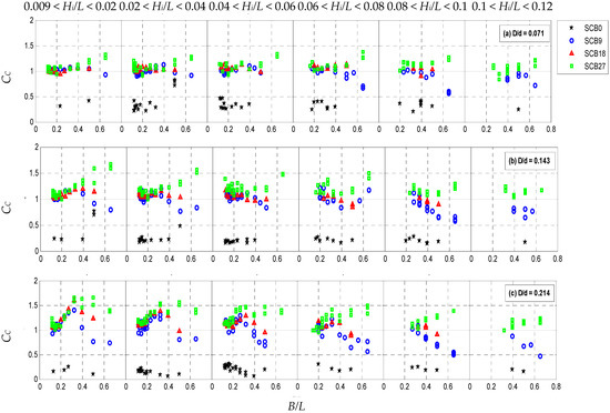 The energy dissipation coefficients, CL, as computed using Equation (3), can be observed in Figure 6. The CL values for the SCB0 model exhibited distinct differences compared to those of the perforated models. They showed smaller variations within the respective ranges of wave steepness and did not follow a clear pattern with B/L. Nevertheless, the CL of the SCB0 model increased at varying rates with D/d and Hi/L. The maximum CL values obtained for D/d = 0.071, 0.143, and 0.214 were 0.65, 0.80, and 0.85, respectively, often occurring at the higher range of wave steepness. The SCB0 model demonstrated superior energy dissipation compared to the perforated models when subjected to longer-period waves and smaller immersion depths. Furthermore, it should be noted that the energy dissipation for permeable breakwaters was higher than that of SCB0 for all D/d values and wave steepness when B/L was higher than 0.3. However, it is important to highlight that the opposite trend was observed when B/L was less than 0.3, where SCB0 exhibited higher energy dissipation compared to permeable breakwaters. For the perforated SCB models, the maximum CL values exceeding 0.8 were attained within the range of 0.4 < B/L < 0.5, particularly for D/d = 0.143 and 0.214. Beyond B/L > 0.5, a slight degradation in the dissipation performance of the perforated SCB models was observed. Nevertheless, the overall wave attenuation improvement remained unaffected due to the compensatory effect of a rapid increase in wave reflection at larger B/L values, as observed in Figure 4. The porosity of the breakwater played a role in CL for the perforated models, with SCB9 exhibiting the highest dissipative characteristics, followed by SCB18 and SCB27. Moreover, breakwaters with greater immersion depths demonstrated enhanced dissipative characteristics by providing a larger geometrical domain for wave–structure interactions to occur. Furthermore, the influence of wave steepness on CL was significant for the perforated models, as waves with higher steepness resulted in greater energy dissipation when interacting with the porous structures. In summary, when exposed to relatively short-period waves, the perforated SCB models can be considered more effective in dissipating energy compared to the SCB0 model.