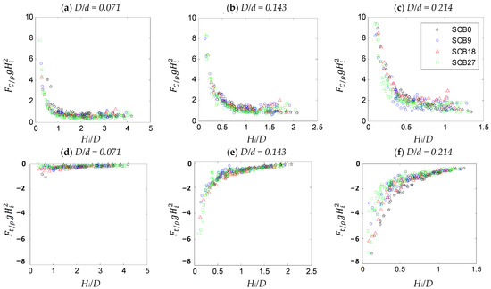 where ρ is water density and g is the gravity acceleration. The influence of wave period to the horizontal force is relatively small [38]; therefore, it was excluded from the analysis. In this study, the test models were fixed at d/B = 1.4 throughout the experiments. Note that the effect of varying d/B ratios is under investigation and will be reported in the future.