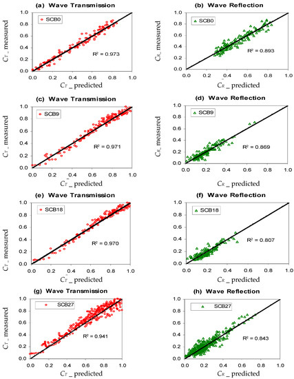 A number of empirical formulae for the prediction of the overall hydrodynamic performance of the SCB models were developed using multiple regression methods. While previous research focused on random waves [5], the current study investigated the behavior of semicircular breakwaters under regular wave conditions. However, the empirical relationships derived from previous work [5] are still relevant and provided a basis for the calculation of the CT and CR coefficients in Equation (8), as well as the Fn,c and Fn,t coefficients in Equation (9). This research acknowledges the previous findings and adapted them to the specific context of regular waves, ensuring a consistent and informed approach to predicting hydrodynamic performance.