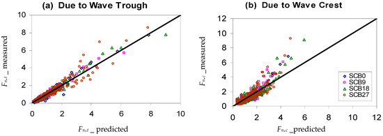 The horizontal wave force acting on the SCB models (for a unit width) by the wave crests and troughs were normalized in the form of the force coefficients as Fn,c and Fn,t, respectively: