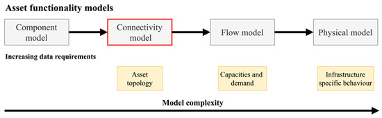 The most intuitive method for representing infrastructure network functionality and capturing how direct impacts propagate through a network, is to create a network graph using graph theory. Infrastructure asset components can be represented as networks of nodes (points) which are interconnected with edges (lines). A network graph can be directed, undirected, and multi-graphed (allowing for parallel edges connecting two nodes). Along with this, there are additional model formulations of networks which can be implemented with additional data, such as capacities and demands of assets to create flow networks. For critical infrastructure networks, a functionality network analysis can be broadly split to three main levels of analysis, with each level requiring an increasing amount of data to characterise the network. This is summarised in Figure 2.