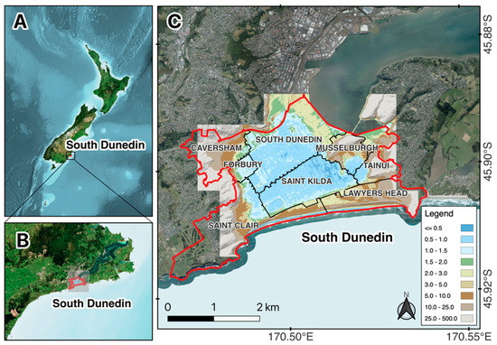 Location of the study site: (A) South Dunedin is located in the South Island of New Zealand. (B) Overview of Dunedin City. (C) The local area is overlaid with the digital elevation model (DEM) [21] with South Dunedin suburbs labelled and outlined in red [22].
