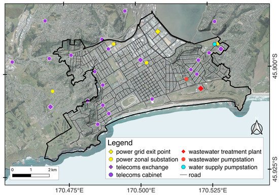 South Dunedin is built largely on reclaimed salt marsh land less than three meters above present-day mean sea level (MSL) [23]. The geomorphic setting and low elevation mean the area is subject to various natural hazards [24] with future coastal flooding in response to relative sea-level rise (RSLR) being a high concern. Several national-scale studies enumerate building [25,26] and infrastructure network component [27] exposure to extreme sea level (ESL)-driven coastal flooding and RSLR in the Dunedin urban area. While exposures are not directly reported for South Dunedin in these studies, 0.3 to 1 m RSLR is expected to double present-day building and network component exposure to 100-year ESL flooding. As depicted in Figure 4, several key infrastructure network components servicing South Dunedin could be exposed to future 100-year ESL flooding. Thus, investigating direct and indirect service disruption across multiple interdependent networks is timely with 0.3 to 1 m RSLR projected to occur for the Dunedin urban area in the next 40 to 90 years under Shared Socioeconomic Pathways (SSPs) median SSP2-4.5 and SSP5-8.5 scenarios for the region, when also considering vertical land movement caused by seismic tectonic uplift, land compaction or sediment accumulation [28].