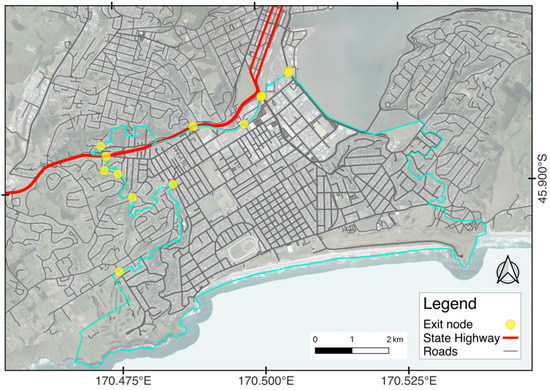 The direct impact exposure and vulnerability assessment was conducted using the open-source software RiskScape [33]. The flood hazard depth was sampled at the asset centroid, and for roads, all intersections with the hazard were recorded. An asset is considered non-functional and directly damaged if the damage ratio of the corresponding flood depth exceeds 0.5. The value of 0.5 is selected, to represent a “severe” damage state [32]. The connectivity model is built by connecting asset nodes to their source node using pipe and line data. Where unavailable, asset nodes were connected to source nodes via the shortest path along road corridors, following the assumption that utilities generally follow the road network. For roads, a network graph was readily available using the library OSMNx [34]. The source nodes were points on the boundary edge of the study extent that can access the state highway. Figure 5 shows an example of these nodes.