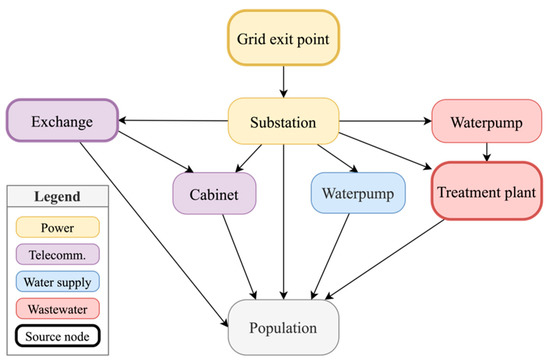 Dependency diagram relating the relationships modelled. Source nodes for each critical infrastructure are bolded.