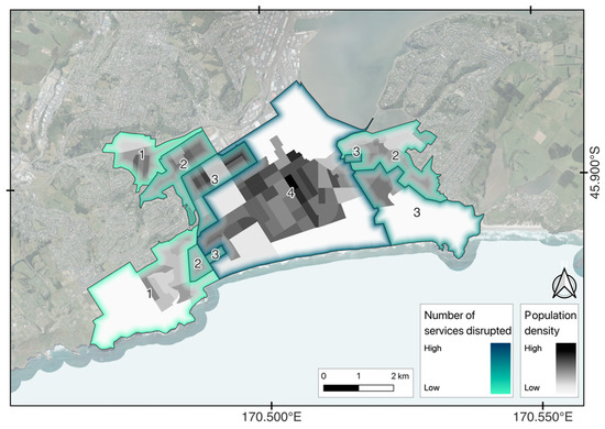 Number of infrastructure services lost in the study area at the tipping point of SLR 60 cm. The numbers and colours denote the number of infrastructure services lost. A high proportion of the population loses all four services, occurring where the high population density is represented in greyscale.