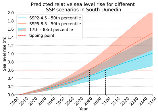 The results provide an initial view and approximate time period to implement adaptations. To provide additional context, the implications of this modelling are linked to the projected SLR scenarios for the region; here, we have used SSP2-4.5 and SSP5-8.5 scenarios with the 50th percentile and the 17th–83rd percentile range. Figure 9 presents these sea-level rise scenarios over time, including the effect of vertical land movement [28]. This shows that in the more pessimistic scenario, the impacts discussed previously could be observed in approximately 60 years for the 50th percentile, pushing out to 80 years for the more optimistic scenario. Regardless, these are both within normal planning timeframes and the design life of many infrastructure assets such that adaptation should be considered a priority.