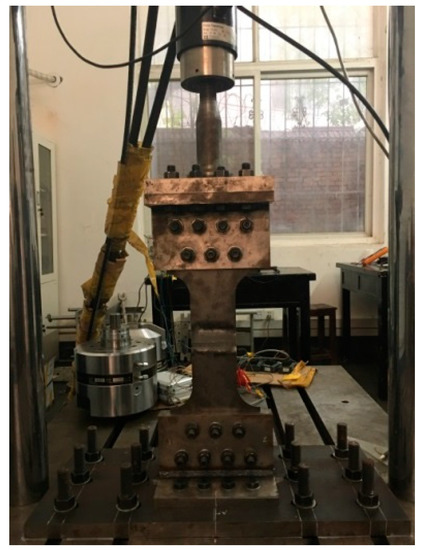 The experiments were conducted at room temperature of approximately 20–25 °C and in the air. A computer-controlled servo-hydraulic test machine MTS322 (±250 kN) was used in the testing process, as shown in Figure 2. Each specimen was subjected to load control at a frequency of 1 Hz using a sine wave, with a maximum applied load of 95 kN and stress ratios of 0, 0.1, and 0.2, respectively. The applied cyclic loads used in the present experiment are categorized as low cycle fatigue loads due to the fact that the fatigue lives of smooth specimens subjected to the same cyclic loads are shorter than 10,000 cycles. The crack length was determined by a metallographic microscope connected to a video travelling microscope, while an electronic extensometer was installed on both sides of the crack surface to measure the crack opening displacement (COD). The test procedure for evaluating the behavior of a cracked plate can be divided into three distinct steps. Firstly, the area around the crack is carefully sanded to ensure a smooth surface, and strain gauges are affixed to collect data on the crack tip strain value. After the preparation work, the cracked plate is fixed to the MTS by bolts. Then, a single loading is required before cyclic loading to remove the initial deformation of the cracked plate. Finally, the loading equipment program is adjusted, and cyclic loading is performed while collecting data on COD using an extensometer and observing the crack growth process using a metallographic microscope. The MTS is set up with displacement protection to prevent excessive displacement caused by fracture failure of the cracked plate to prevent damage to the machine. The loading conditions and experimental results of AH32 steel are summarized in Table 2.