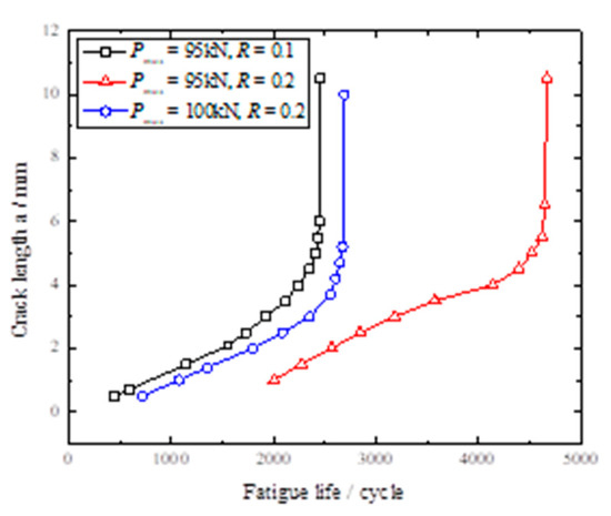In order to study the impact of the maximum applied load and stress ratio on fatigue crack growth behavior in cracked plates, a series of low cycle fatigue tests were performed. As depicted in Figure 3, the results indicate that an increase in the maximum applied load at a constant stress ratio leads to an increase in crack growth rate, resulting in shorter fatigue life. Conversely, when the maximum applied load remains constant, an increase in the stress ratio leads to a decrease in the crack growth rate, thereby prolonging the material’s fatigue life. Figure 4 illustrates how crack opening displacement (COD) varies under different stress ratios, revealing that the effect of various loads on COD differs. Specifically, as the stress ratio increases, the value of COD does not change significantly during the early stages, displaying an approximately linear relationship. However, once the crack has propagated to a certain extent, the COD value begins to increase significantly until the plate fractures. Notably, the change in COD value accurately represents the crack growth rate.