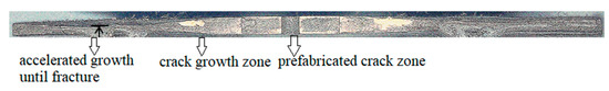 In Figure 5, the fracture morphology of an AH32 steel specimen examined during a fatigue test with a stress ratio R = 0.1 is presented. The prefabricated crack area has a relatively smooth surface because it was produced using wire-cut EDM. It is noticeable that there is a significant accumulation of plastic deformation near the crack tip region, and the crack growth zone exhibits plastic slip, which is relatively smoother than the accelerated growth zone. This phenomenon occurs due to the continuous stretching and extrusion of the upper and lower surfaces of the crack during its growth process. As the crack enters the accelerated growth zone, it primarily stretches instead of being extruded, resulting in a comparatively rough section in this part. This section is similar to the fracture surface observed in cases of static load damage.