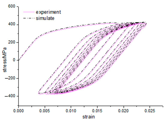 To validate the rationality of the numerical model, a finite element analysis was performed with a stress ratio of 0.1. The obtained stress–strain curve from the analysis was then compared with the experimental stress–strain curve, as shown in Figure 7. From Figure 7, it can be observed that the experimental and numerical stress–strain curves are in good agreement, indicating that the chosen material parameters in the FE model accurately reflect the stress–strain behavior of the material and the rationality of the numerical model.