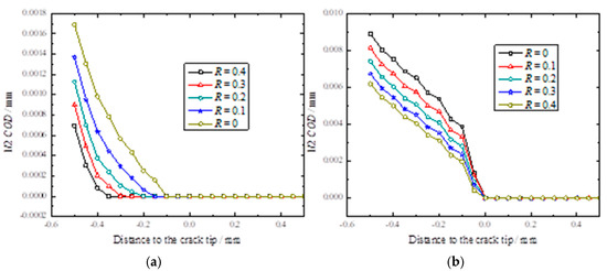 The opening and closing of crack opening displacement (COD) can better reflect the change in the crack surface during the crack propagation process. Figure 8 shows the variation of COD under different stress ratios and a maximum applied load of 95 kN. It is evident that the crack is closed at the minimum applied load, with increasing stress ratios leading to larger closure effects. This implies that higher stress ratios tend to bring the crack surfaces closer together, thereby hindering crack propagation. Furthermore, the COD is reduced at the maximum applied load with an increasing stress ratio, primarily due to a decrease in effective driving stress. As the stress ratio increases, the proportion of the applied load that contributes to driving the crack further decreases. Consequently, the crack growth rates are reduced due to the reduced driving force. This finding indicates that higher stress ratios exacerbate the crack closure phenomenon, resulting in reduced crack growth rates, and ultimately causing a retardation effect.