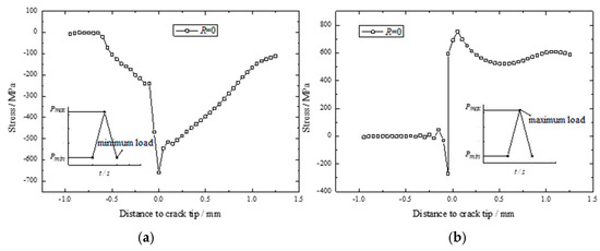The distribution of crack tip stress field (a) at minimum applied load and (b) at maximum load.
