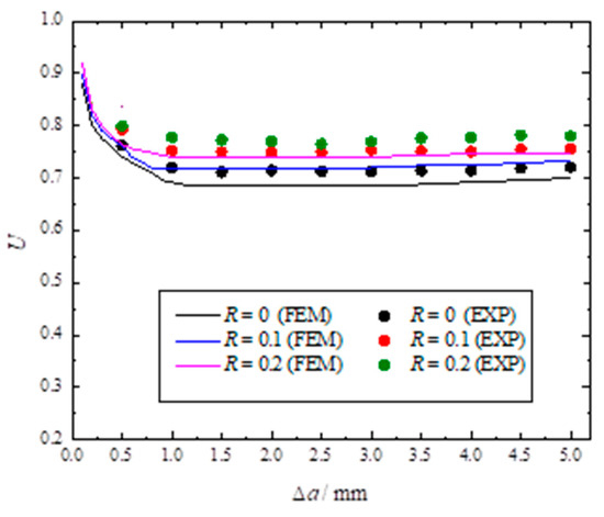 Figure 10 illustrates the load ratio parameter for different stress ratios, with a comparison between the numerical simulation and test results, where the solid lines represent the FE results and the solid circles represent the test results. The results show that as the stress ratio increases, the load ratio parameter also increases while the crack closure effect weakens. This is because larger stress ratios increase the minimum stress level, which offsets some of the residual compressive stress at the crack tip that promotes crack closure. Consequently, the crack closure effect diminishes. While Figure 10 shows noticeable differences between the experimental and numerical results, the latter demonstrates a more prominent crack closure effect. The average errors in the load ratio parameter for increasing stress ratios are 3.6%, 3.9%, 4.1%, and 4.4%, respectively. Possible reasons for these errors include the idealized numerical simulation of the crack without accounting for blunting at the crack tip, which affects the level of crack closure. Additionally, the extensometer’s relatively large distance from the crack tip in the experiment may have resulted in small measured results due to its insensitivity. Lastly, processing procedures and the initial defects of the specimen could also contribute to measurement errors.