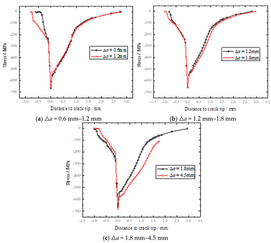 The loading and unloading of cyclic loads can cause changes in the stress field at the crack tip, leading to crack closure and propagation behavior. Figure 9 illustrates the distribution of the normal stress, , at the crack tip in the y = 0 plane at maximum and minimum applied loads, respectively. It is evident from Figure 9 that plastic deformation occurs behind the crack tip as the load gradually decreases to the minimum applied load, resulting in a compressive stress field that partially closes the crack. As the crack length increases, the residual compressive stress at the crack tip remains almost constant. However, the stress concentration at the crack tip can cause the material to enter a reverse yielding state. Upon loading to the maximum applied load, the crack opens and enters the forward-yielding state, resulting in tensile plastic strain. This analysis indicates that during cyclic loading and unloading, the crack tip experiences reciprocal action between forward and reverse yielding states, leading to the gradual accumulation of plastic strain and prompting crack propagation.